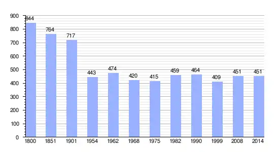 Los datos demográficos contemplados en este gráfico de la comuna de Saint-Julien[4] se han cogido de 1800 a 1999 de la página francesa EHESS/Cassini, y los demás datos de la página del INSEE.[5]