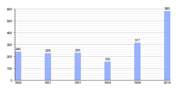 Los datos demográficos contemplados en este gráfico de la comuna de Mondongo se han cogido de 1800 a 1999 de la página francesa EHESS/Cassini,[4] y los demás datos de la página del INSEE.[5]