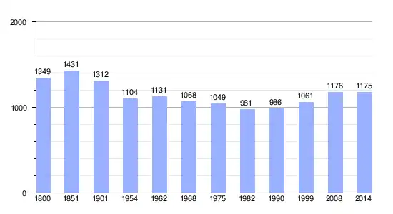 Los datos demográficos contemplados en este gráfico de la comuna de Saint-Martin-des-Besaces[4] se han cogido de 1800 a 1999 de la página francesa EHESS/Cassini, y los demás datos de la página del INSEE.[5]