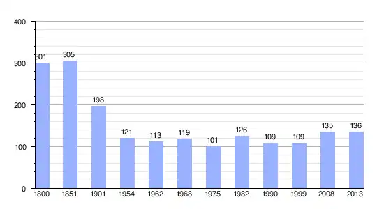 Los datos demográficos contemplados en este gráfico de la comuna de Saint-Maurice-de-Tavernole[4] se han cogido de 1800 a 1999 de la página francesa EHESS/Cassini, y los demás datos de la página del INSEE.[5]