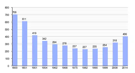 Los datos demográficos contemplados en este gráfico de la comuna de Saint-Ouen-des-Besaces[4] se han cogido de 1800 a 1999 de la página francesa EHESS/Cassini, y los demás datos de la página del INSEE.[5]