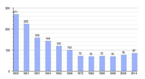 Los datos demográficos contemplados en este gráfico de la comuna de Saint-Ouen-le-Houx[4] se han cogido de 1800 a 1999 de la página francesa EHESS/Cassini, y los demás datos de la página del INSEE.[5]