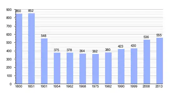 Los datos demográficos contemplados en este gráfico de la comuna de Saint-Paul-de-Loubressac[4] se han cogido de 1800 a 1999 de la página francesa EHESS/Cassini, y los demás datos de la página del INSEE.[5]
