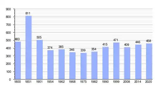 Los datos demográficos contemplados en este gráfico de la comuna de Saint-Rigomer-des-Bois[4] se han cogido de 1800 a 1999 de la página francesa EHESS/Cassini, y los demás datos de la página del INSEE.[5]