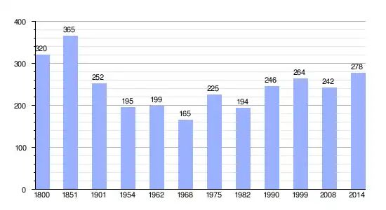 Los datos demográficos contemplados en este gráfico de la comuna de Sainte-Marguerite-sur-Fauville[4] se han cogido de 1800 a 1999 de la página francesa EHESS/Cassini, y los demás datos de la página del INSEE.[5]