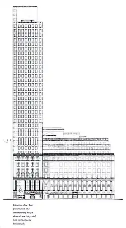 Los primeros siete pisos del edificio, construido en 1990, tiene en cuenta el estilo del inmueble de 1924.[8] El banco había favorecido una fachada moderna, aunque la Comisión de Preservación de Monumentos Históricos deseaba una extensión de la fachada de 1924. Tanto Saks como las oficinas comparten la fachada de la calle en las fachadas de las calles 49 y 50. La de la calle 50 es una réplica casi idéntica, solo con cambios sutiles en la forma y los detalles, y con ornamentación tallada a mano. Saks ganó dos nuevas vitrinas y una entrada que replicaba la entrada original de la calle 50, mientras que Swiss Bank Corporation ganó una gran entrada de dos tramos de ancho y tres pisos de altura. La fachada de la calle 49 a nivel del suelo es más moderna, aunque con una entrada Saks y vitrinas que reproducen los originales. La fachada se retira de la calle, dando a este lado una pequeña explanada pavimentada. A ambos lados de la nueva entrada de Saks se encuentran su muelle de carga reubicado y una entrada secundaria a la torre de oficinas.[1]