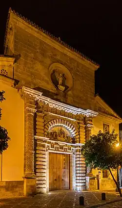 En 1574, en el barrio de intramuros de San Marcos, se instaló la Residencia de la Compañía de Jesús en Jerez. Dentro del complejo, de estilo barroco, se edificó el templo jesuita, con una fachada de columnas repujada y azulejos. El retablo es obra de Diego Roldán. La composición de la fachada es la siguiente: