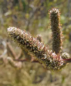 Se trata de un arbusto de ribera que alcanza un tamaño de uno a cuatro metros de altura. Los tallos de color pardo amarillento o rojizo son ligeramente peludos en la textura, las pequeñas ramitas están recubiertas de fibras de terciopelo. Las hojas tienen, por lo general, forma de lanza, bordes suaves o dientes suaves, y parcialmente enrollada debajo de los bordes. Las hojas son peludas, con las superficies inferiores a menudo bastante lanosas. Las hojas maduras pueden tener 14 centímetros de largo o más. La inflorescencia se desarrolla antes que la planta produzca las hojas. Los amentos tienen hasta 5 o 6 centímetros de largo.
