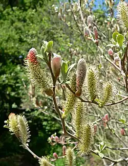 Es un arbusto que alcanza un tamaño de uno o dos metros de altura. Forma matorrales, a veces muy grandes, algunos de los cuales se componen de clones de un solo individuo. El arbusto tiene muchas ramas, que son muy frágiles. Las ramas jóvenes cubiertas de terciopelo o de lana, con abrigos peludos, las ramas más antiguas no tienen pelos. Las hojas son ovales, a veces con puntas, de bordes lisos, y lanoso el envés. Crecen hasta 10 centímetros de largo o más. La inflorescencia se produce antes que las hojas. Los amentos masculinos son unos 3 centímetros de largo y grueso, mientras que los amentos femeninos varían en tamaño.