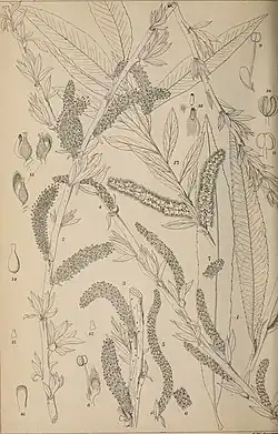 Salix: nombre genérico latino para el sauce, sus ramas y madera.[2]