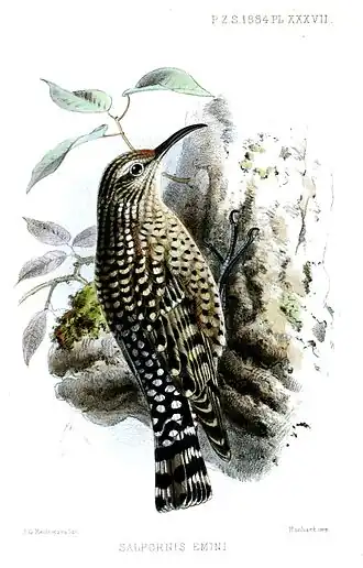 - ↑ del Hoyo, J., Collar, N. & Kirwan, G.M. (2018). «African Spotted Creeper (Salpornis salvadori)». En del Hoyo, J., Elliott, A., Sargatal, J., Christie, D.A. & de Juana, E. (eds.), ed. Handbook of the Birds of the World Alive (en inglés). Barcelona: Lynx Edicions. Consultado el 2 de diciembre de 2018.
