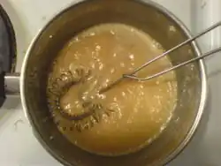 La salsa de caramelo es una salsa hecha de agua caliente y azúcar en un nivel bajo de temperatura hasta que el azúcar se disuelve y se "carameliza", cambiando el color a marrón de oro.