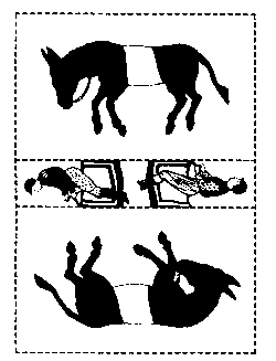 En un papel se encuentra dibujado el perfil de dos burros y de dos jinetes, con una línea de puntos que permite separar a cada uno de los burros, mientras que los dos jinetes permanecen enfrentados en una misma cinta.