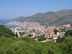 La antigua ciudad de Samos estaba situada en la parte suroriental de la isla,[25] a diferencia de la ciudad actual del mismo nombre, que está en la parte nororiental.