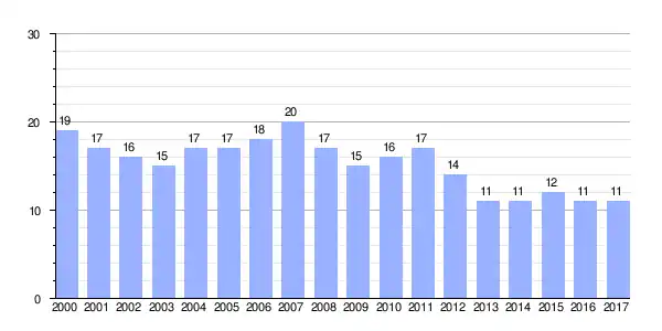 | Gráfica de evolución demográfica de San Bartolomé de Rueda[2] entre 2000 y 2017 |