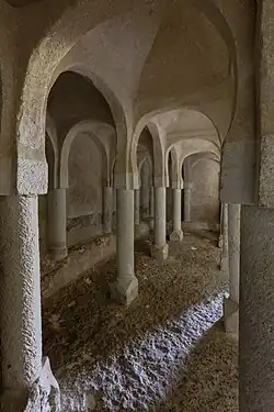 La columnata de arcos de herradura cobija el acceso a la cueva eremítica excavada en la roca que posiblemente dio origen a la congregación monástica.