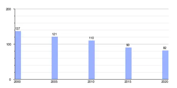 | Gráfica de evolución demográfica de Rececende entre 2000 y 2020 |