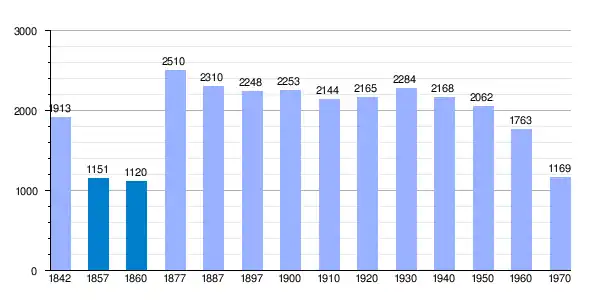 | Gráfica de evolución demográfica de San Esteban de Valdueza[3] entre 1842 y 1970 |