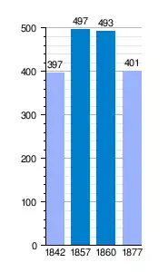 | Gráfica de evolución demográfica de San Felipe Neri[3] entre 1842 y 1877 |