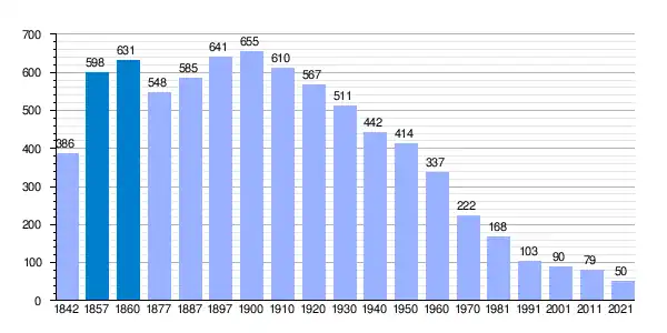 | Gráfica de evolución demográfica de San Martín de Valderaduey[9] entre 1842 y 2021 |