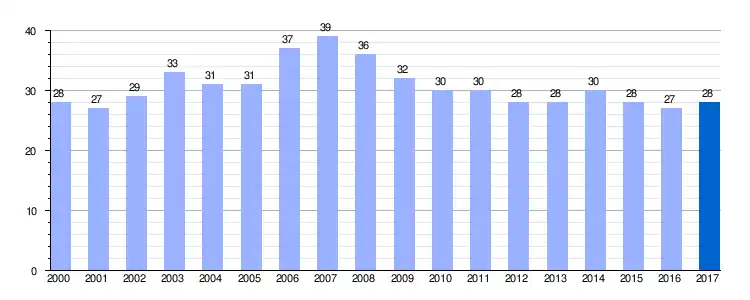 | Gráfica de evolución demográfica de San Martín de Valdetuéjar entre 2000 y 2017 |