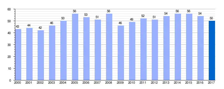 | Gráfica de evolución demográfica de San Martín del Agostedo entre 2000 y 2017 |