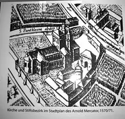 Un riachuelo protegía la parte sur del recinto romano, luego fluía hacia el este y desaguaba en el Rin cerca de la actual plaza Heumarkt. Este arroyo, llamado Rothgerberbach, Blaubach y luego Mühlenbach, fue utilizado para actividades de teñido y molienda, al pie del actual distrito de Pantaleon Viertel, en Altstadt-Süd. La tercera ampliación de la muralla de la ciudad, construida en 1180 por el arzobispo de Colonia, ya incluirá en su recinto a San Pantaleón.