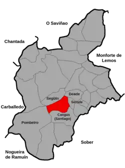 Limita con las parroquias de Seguín y Deade al norte, Serode al este, Cangas al sur y Pombeiro al oeste.