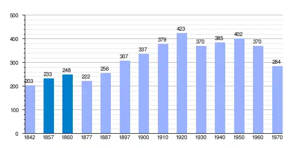 | Gráfica de evolución demográfica de San Pedro de Zamudia[9] entre 1842 y 1970 |