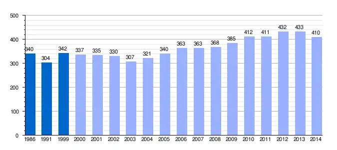 | Gráfica de evolución demográfica de San Salvador entre 1986 y 2014 |