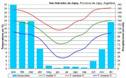 El clima de San Salvador de Jujuy es cálido y suave, con una temperatura media de 19,4 °C, una oscilación anual escasa, de tan solamente 11 °C y unas precipitaciones anuales de 777,7 mm. Los veranos son cálidos, pero sin alcanzar temperaturas extremas, y muy lluviosos, concentrando el verano el 75% de las precipitaciones anuales. Los inviernos son secos y suaves, aunque las temperaturas mínimas pueden ser frías. Cabe destacar que en esta estación se encuentra el mes más seco del año, junio. Asimismo, a pesar de que la ciudad se encuentra cerca del Trópico de Capricornio, se ha registrado la caída de nieve en algunos años, sobre todo en las partes más altas de la ciudad. [2]