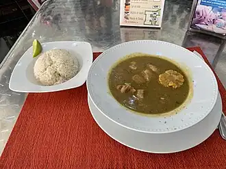 El sancocho dominicano es una sopa de carnes, tubérculos, verduras y condimentos que se mezclan para formar un espeso caldo. Se acompaña con arroz.