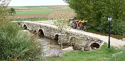 e) Puente medieval conocido como «de las Bodegas» y «Romano». Tiene seis ojos y dos tajamares. No tiene pretil y la plataforma mide 46 m de largo y, según tramos, entre 2,15 y 2,80 m de ancho.[22]