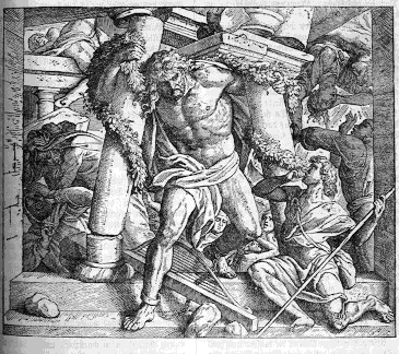 Samson Agonistes se basa en la historia de Sansón del Antiguo Testamento, Jueces 13–16; es, de hecho, una dramatización de la historia que empieza en Jueces 16:23. La obra inicia in medias res. Sansón ha sido capturado por los filisteos, le han cortado el cabello, donde reside su fuerza, y le han sacado los ojos. Sansón está "ciego entre enemigos, Oh, peor que cadenas" (línea 66).