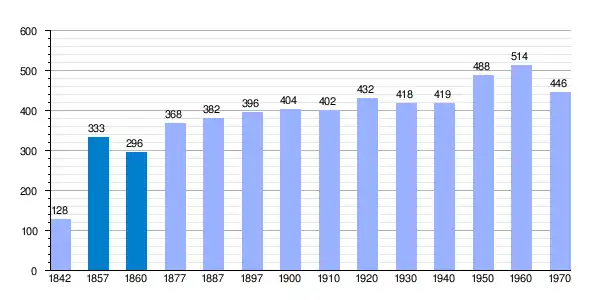 | Gráfica de evolución demográfica de Santa Colomba de las Carabias[7] entre 1842 y 1970 |