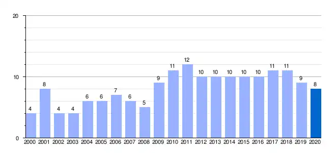 | Gráfica de evolución demográfica de Santa Cruz de los Cuérragos[8] entre 2000 y 2020 |