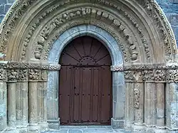 La portada principal, la occidental, está formada por cinco arquivoltas ligeramente apuntadas, de las que la cuarta (contando desde el interior) es de molduras aboceladas, la primera, la tercera y la quinta presentan su dovelaje labrado con motivos vegetales, y, por fin, la segunda arquivolta va tallada con una variada muestra de figuras escultóricas, tales como leones, cabezas humanas y de animales, dos parejas de músicos, etc. Las cinco arquivoltas no apoyan en idénticos soportes: dos de ellas lo hacen sobre columnas de fuste circular, mientras que las otras tres descargan sobre ángulos del muro cuyas aristas forman un cuarto bocel a modo de columnilla entrega. En todo caso, a uno y otro lado de la portada existen cinco capiteles y sobre ellos un cimacio corrido o imposta, muy decorada, que avanza por las jambas de la puerta. Los capiteles muestran espléndidas tallas de gran relieve de variada y magnífica iconografía: dragones alados, centauros, grifos y toda clase de animales mitológicos y quimeras, así como una escena que pudiera ser La Anunciación. Como nota de originalidad, uno de los fustes del lado derecho lleva labrada una imagen de San Miguel en lucha con el demonio.