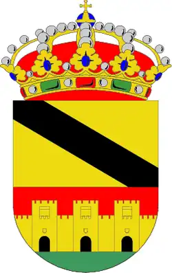 «Escudo cortado,1.º en campo de oro una banda de sable. 2.º en campo de gules una muralla de oro, manzonada de sable y terrasada de sinople, con tres torreones, cada uno de ellos con una puerta de sable. Escudo timbrado con una corona real de oro tal como figura en el dibujo número 5 de la memoria.»Boletín Oficial de Castilla y León nº 186. 25 de septiembre de 2000[11]