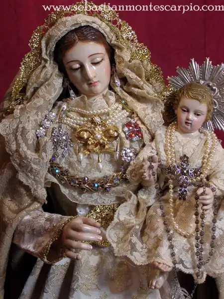 La Señora, se encuentra de pie, con la testa ligeramente ladeada y el pelo recogido en un moño bajo, posee ojos de cristal y gran belleza serena en su rostro, con la mirada baja mientras sonríe con melancolía al Divino Infante (en alusión a la Profecía de Simeón que la asocia al doloroso destino del Hijo), al cual sostiene en su lado izquierdo.