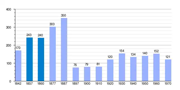 | Gráfica de evolución demográfica de Santa Olalla de Yeltes[3] entre 1842 y 1970 |