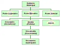 El alcalde es responsable por la ejecución de las leyes, la administración correcta del dinero recaudado por el municipio, a través de los impuestos, y la solución de los problemas de la comunidad municipal. Es ayudado por el vicealcalde y por los secretarios municipales.