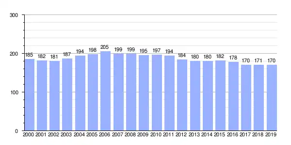| Gráfica de evolución demográfica de Ois entre 2000 y 2019 |