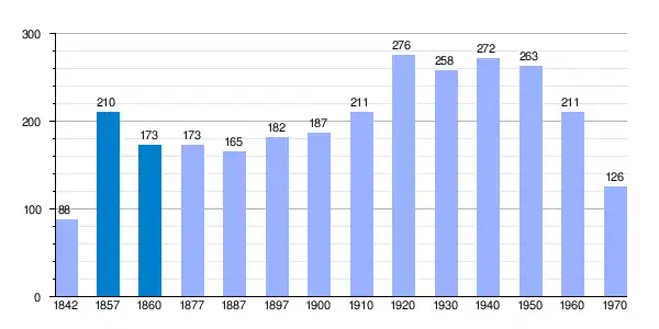| Gráfica de evolución demográfica de Santibáñez de Resoba[2] entre 1842 y 1970 |