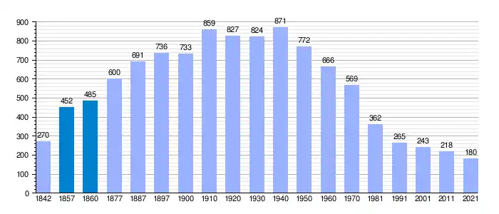 | Gráfica de evolución demográfica de Santibáñez de la Sierra[6] entre 1842 y 2021 |
