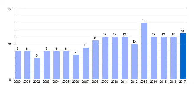 | Gráfica de evolución demográfica de Santibáñez del Río[5] entre 2000 y 2017 |