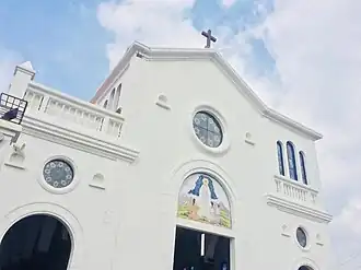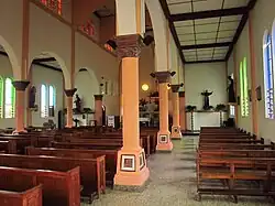 De aspecto románico, en estilo historicista. Con una altura total de 10.5 m, un ancho de 7,03 m y una longitud en su interior de 176.8 metros. Su piso es de mármol italiano (al igual que la nave, los pilares y el altar principal de la iglesia); con un campanario que se dejó de usar en la parte superior izquierda de su fachada. Las campanas y el repique diario son suplidos por una grabación a través de unos megáfonos ubicados en el punto más alto de la iglesia. Tiene un ábside en su nave central, adornado con una secuencia de flores pintadas en los pilares que representan la Coronación de la Virgen María.
