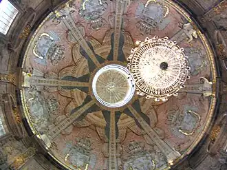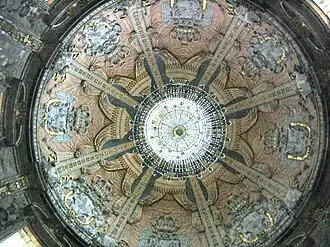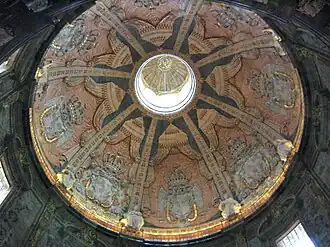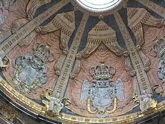 En los lienzos que componen las paredes de la cúpula están representados, labrados y policromados, los escudos de la casa de los Austrias y de los Borbones.