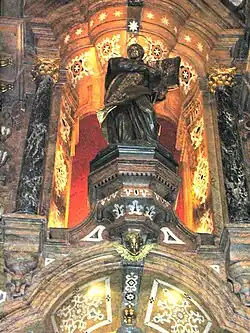 La casa de Austria fue la impulsora de la construcción del santuario, pero este se realizó bajo la dinastía de los Borbones. Por ello sobre el pórtico se ubica un gran escudo de los Borbones. Bajo el techo en el pórtico se hallan las estatuas de san Ignacio, san Francisco Javier, san Francisco de Borja, san Luis Gonzaga y san Estanislao de Kostka realizadas por el escultor italiano Gaetano Pace y por el cántabro Miguel de Mazo, a quien se le encargó la finalización del proyecto a la muerte de Pace en 1738.