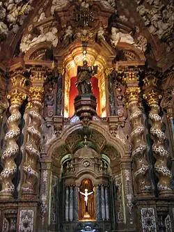En el interior, el churrigueresco lo inunda todo. Está realizado en mármol con mucho dorado, con un piso del mismo material dibujando un gran mosaico.