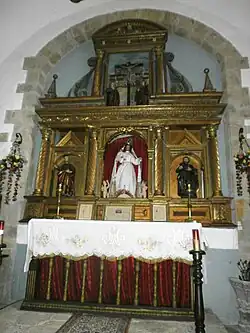 No se sabe cómo estaba construida la capilla mayor que en la actualidad está cubierta mediante una bóveda de arista. Sin embargo, se sospecha que, dado que dos claves de las bóvedas de lacería están montadas en dos casas del pueblo, éstas pudieran haber sido las que pertenecieron a la iglesia, y que debió quedar arruinada por la caída de algún rayo de los muchos que caen en la zona, como se indicó al principio del artículo. Debió ser en esta época cuando se colocó la imagen de santa Bárbara sobre el arco situado en la fachada principal de la iglesia.[22] Es necesario hacer referencia especial a que la gran devoción que se tiene en esta zona a santa Bárbara es muy anterior a que estos lugares tuvieran las muchas explotaciones mineras que han existido. La razón de la devoción es que a este santuario pertenece la talla de santa Bárbara más antigua conocida, como la casi totalidad de las imágenes románicas. Santa Bárbara tiene una actitud estática, sedente y frontal.[24]